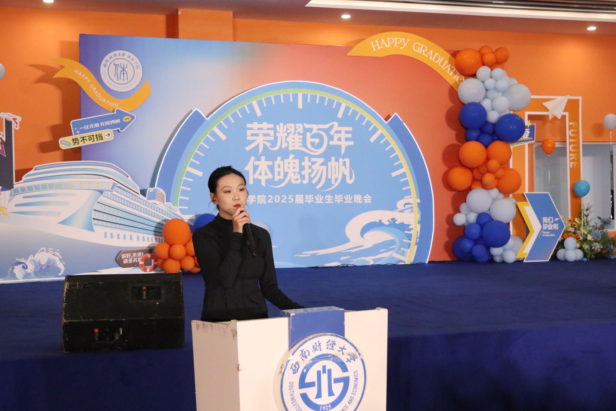 在校学生代表江红梅发言说:作为学弟学妹,很幸运能够和师兄师姐们缘聚西财,在你们身上看到了各种不同的未来,也希望我们能够向师兄师姐们一样顺利去往更加宽广的天地。
