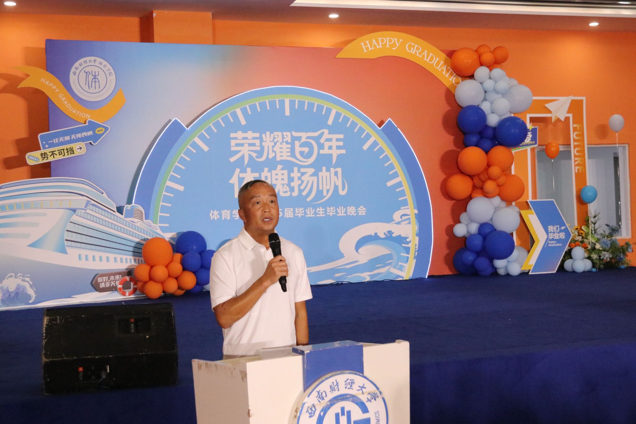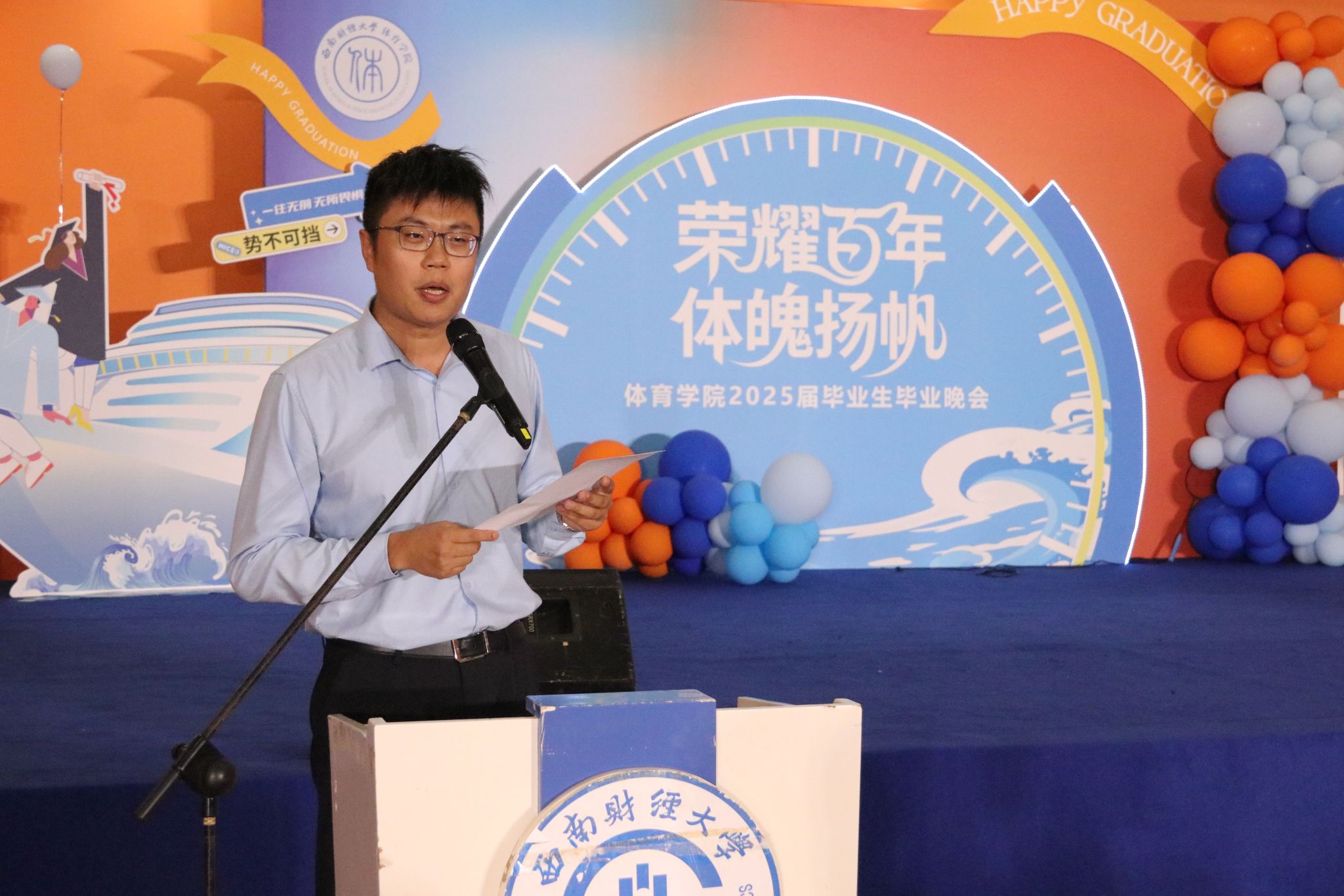 乐玩体育平台APP主持工作的副院长陈丛刊讲话,他祝贺学院2025届毕业生顺利完成学业。同学们参与了彼此的青春,也见证了相互之间的成长,从陌生到熟悉,是缘分将大家相聚于西财。对于即将踏上人生的新征程,他希望大家永远热烈昂扬,始终保持刚进校园的那一颗颗赤子之心,在未来的工作和生活中发光发热,活出西财体育人的精彩。